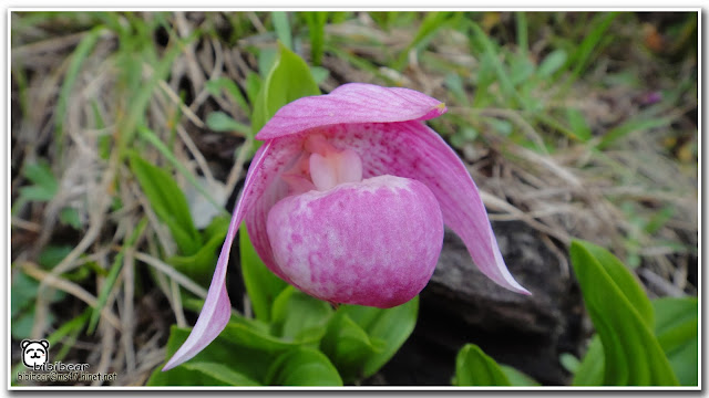 花:花期 5~6月,單朵粉紅色具紅色條紋的花,唇瓣囊苞狀,口緣波狀,花瓣長橢圓形,上萼片橢圓形